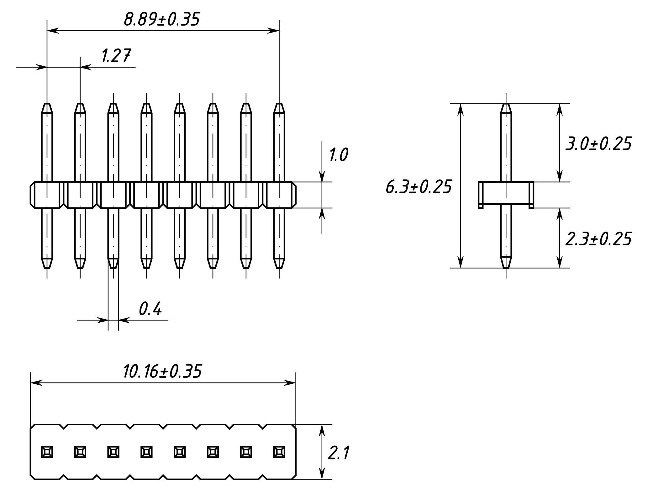 Однорядная штыревая вилка, 8 контактов с шагом 1.27мм